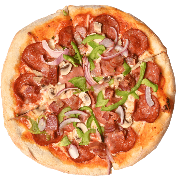 Tomato sauce, mozzarella, pepperoni, mushroom, green pepper, onion and Bacon